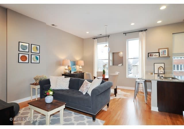 Pottery Barn perfect 2bed/2bath in the heart Wicker Park just steps from Division/ blue line. Converted in 2008. Soaring ceilings, oak hardwood floors & flooding with light. Open layout boasts eat-in kitchen complete with white subway tile backsplash, flat panel espresso cabinetry, Bosch & GE stainless appliances. True master suite features wall of closets & en-suite natural stone bath, double vanity & separate shower. Well appointed 2nd bed & full bath. Separate storage room included. Deeded ext parking space included in price. Enjoy summers across the street at Pulaski Park & pool. Walk to the blue line. Don't miss!