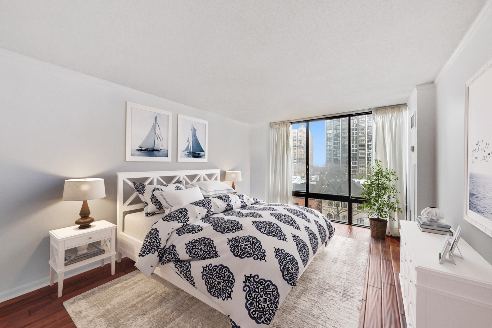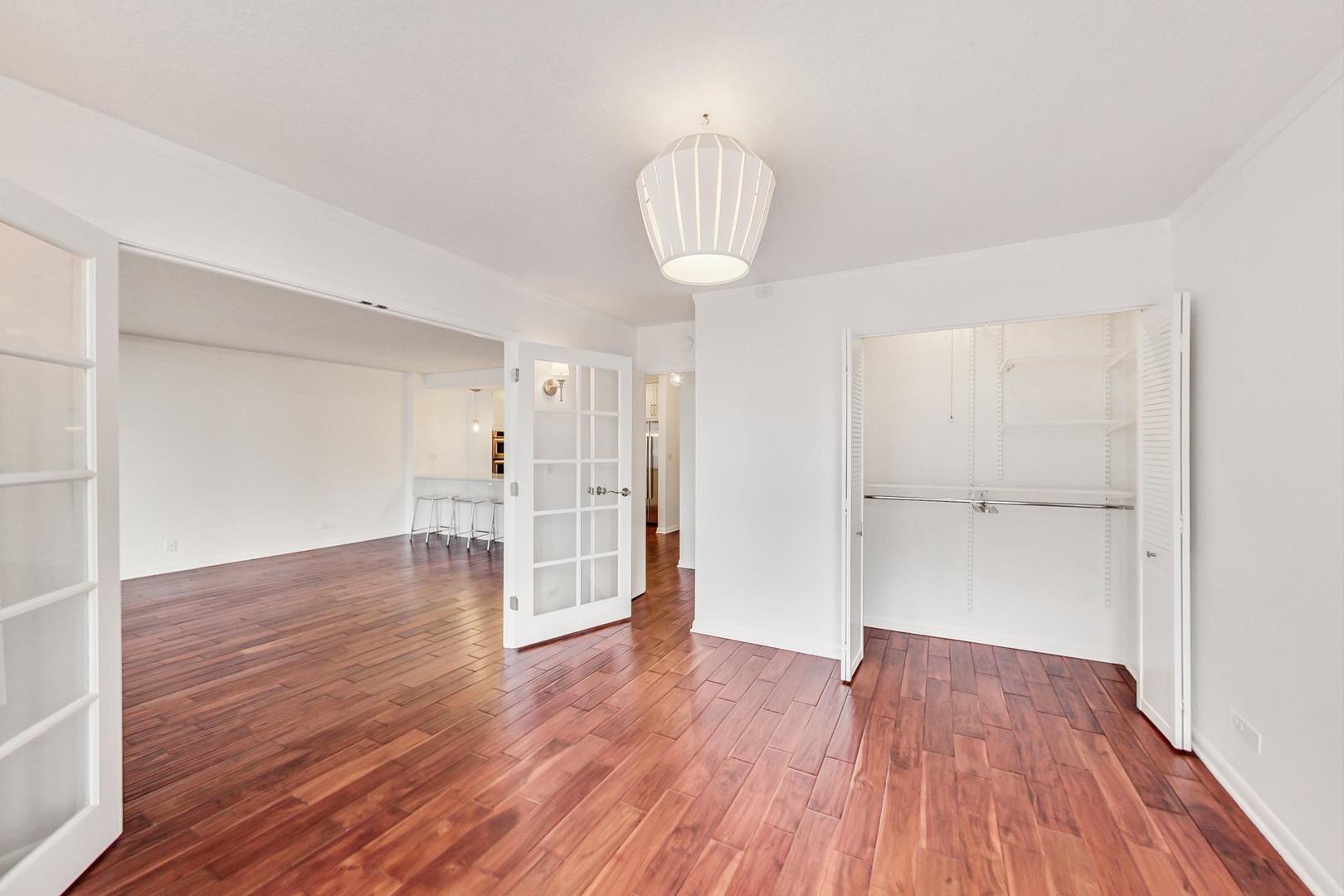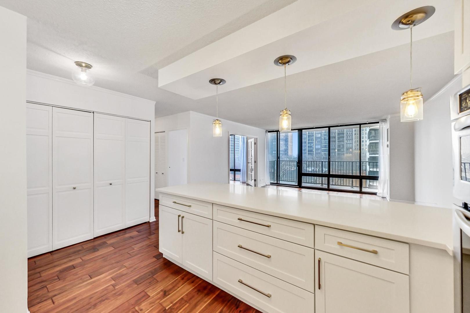 Sun drenched move in ready 2bed/2bath east facing with park and lake views. Beautiful hand scraped wide plank hardwood floors and new light fixtures throughout the unit. Fully remodeled chef's kitchen with new white shaker cabinets, tile backsplash, new SS KitchenAid & Bosch appliances with breakfast bar. Kitchen connects to a gracious living space with floor to ceiling windows and balcony access. Large primary bedroom with ample closet space and renovated ensuite luxe marble bathroom including Grohe and Moen fixtures. Well appointed additional bedroom which can be utilized as bedroom, office or dining room. Second bathroom remodeled as well with a new modern tub. Elfa closet organization systems in all closets. Full service building with 24 hr doorman, gym, sauna and outdoor pool/sun deck. Additional storage unit included, building is pet friendly(no weight limit) & indoor parking is available for rent.