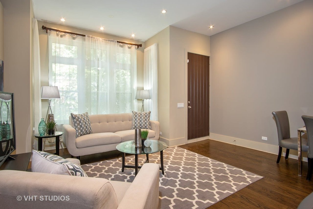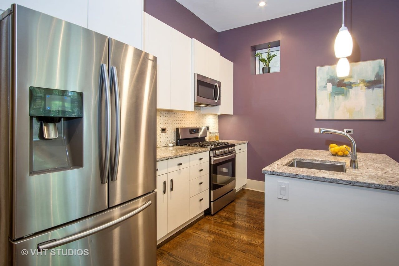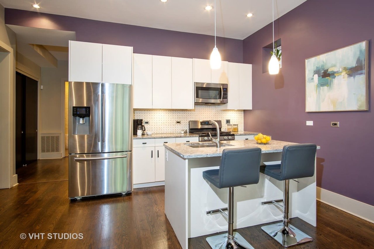 Super cool and stylish 2BR/2BA duplex down in Ukrainian Village! With almost 1400 square feet over two levels, this is not your average cookie cutter condo. Walk in to over 10-foot tall ceilings and attention to detail with fantastic finishes throughout! Rich, dark hardwood floors on the main level, nicely updated kitchen with white cabinets, newer stainless steel appliances and full backsplash. One bedroom and bathroom on the main level, lower level with family room and second bedroom and bathroom. Both bathrooms are finished beautifully with heated floors on main level bath. In-unit washer & dryer. Solid core dark wood closet doors throughout are a nice touch. Tandem parking spot is included in the price. Front patio that fits small table or grill. This unit shows extremely well and is priced to sell. Great location, two blocks to Chicago Avenue and tucked away on a tree-lined street!