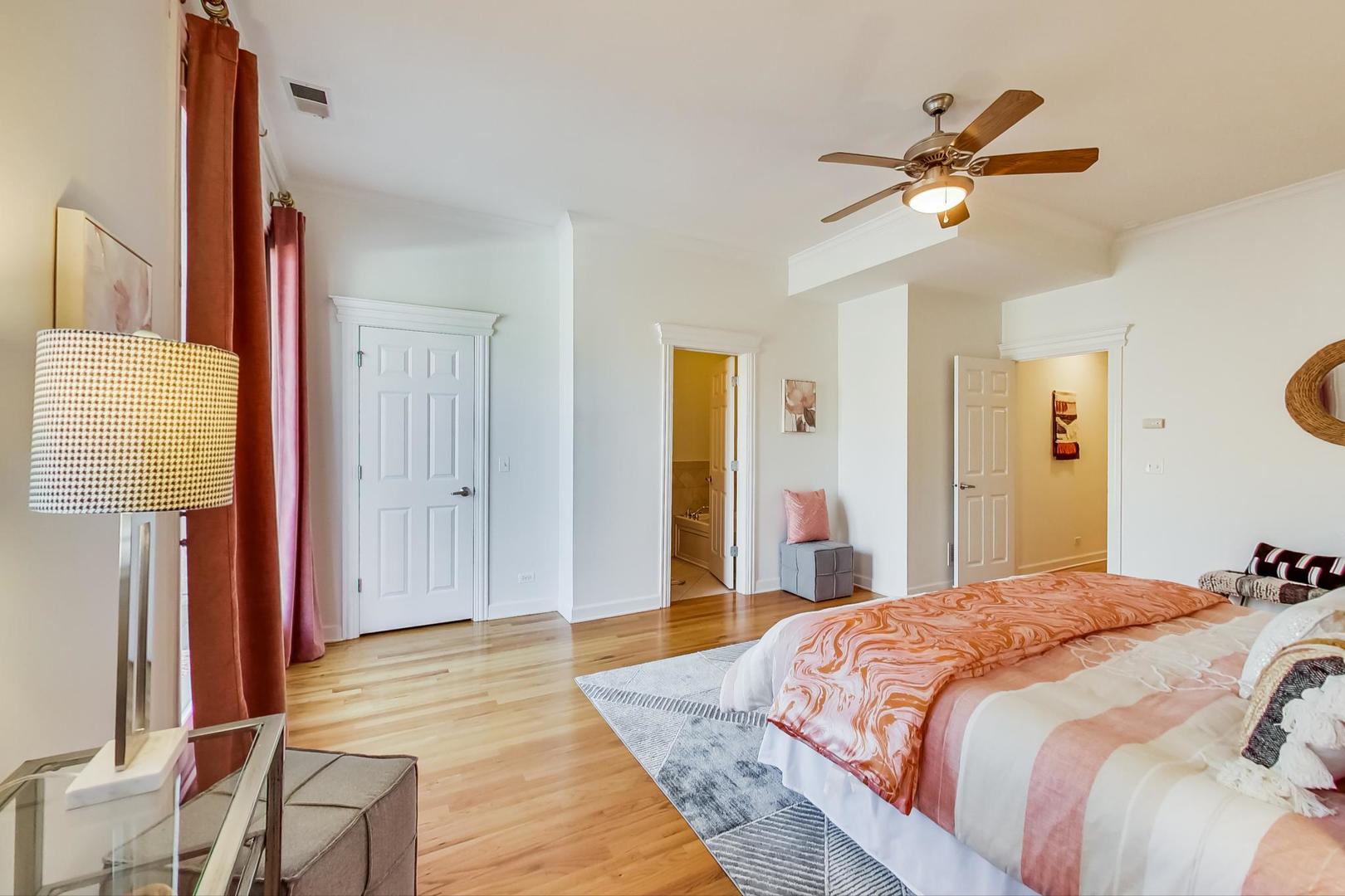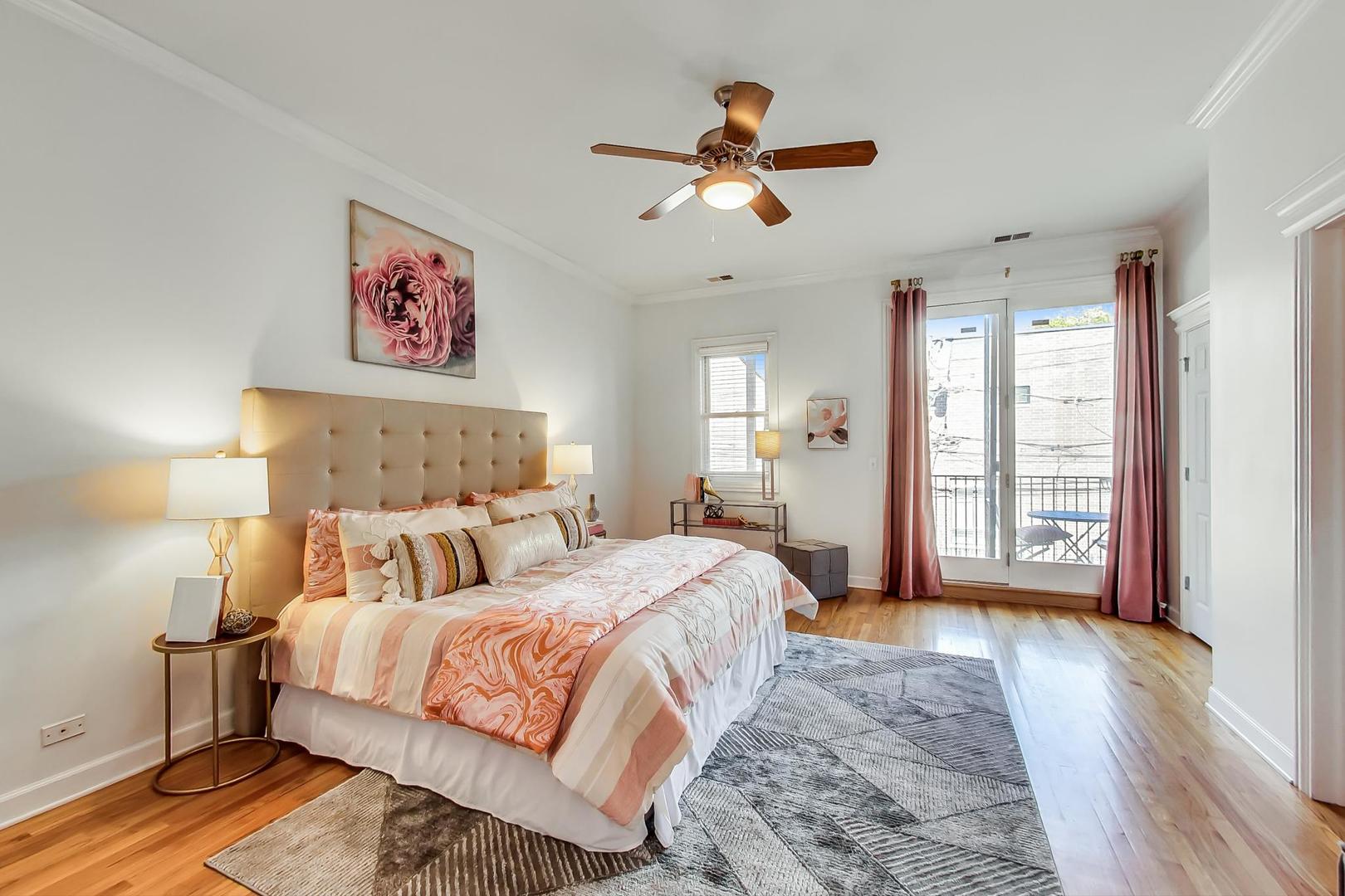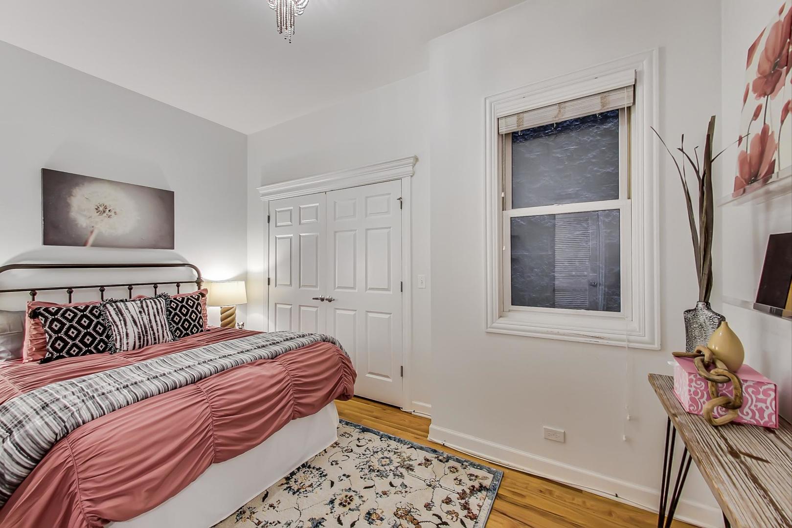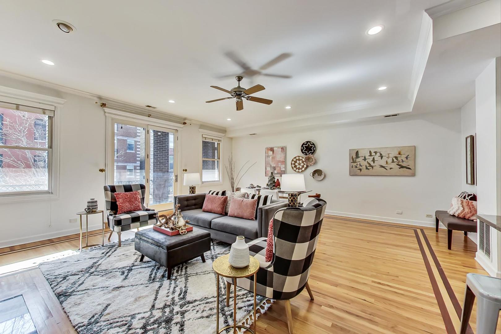 Stunning, extra-wide 3 bedroom/2 bath in the heart of Roscoe Village! Large living space flooded w/light and gorgeous hardwood floors + crown molding throughout. Flexible living & dining space with wood-burning fireplace w/gas starter. Open chef's kitchen with freshly painted cabinets, granite counters, long breakfast bar + stainless steel appliances. Spacious primary suite with WIC and luxe ensuite bathroom w/dual vanities. Gracious floor plan allows for large second and third bedrooms with ample closet storage.Two large outdoor spaces to enjoy! In-unit washer/dryer, large extra storage room and two tandem parking spots included! Great location - close to everything in Roscoe, bars/restaurants/entertainment on Belmont, steps to Hamlin Park + Felger Playlot, and short walk to the Paulina brown line stop.