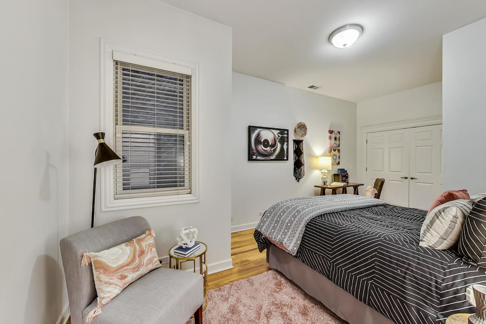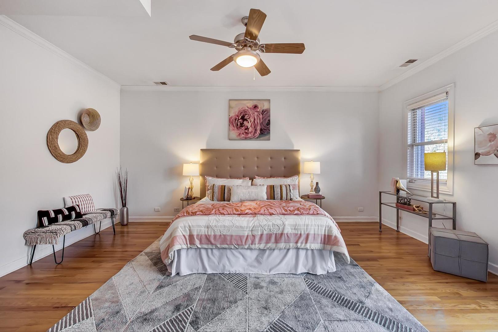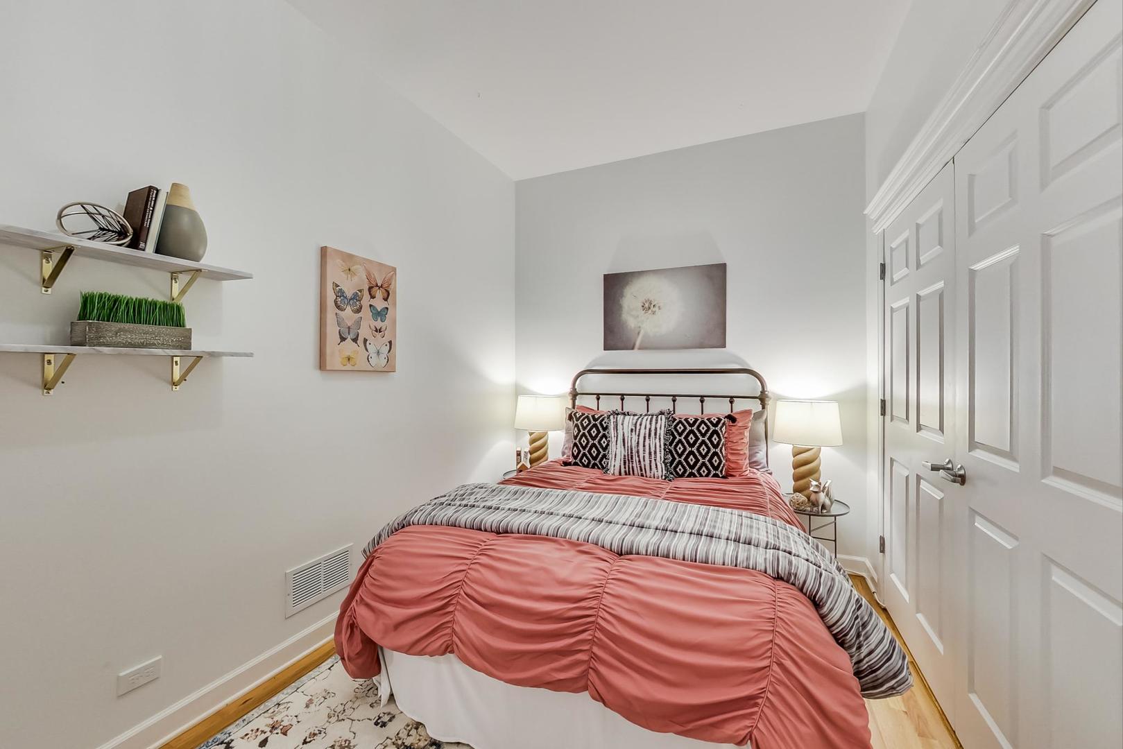 Stunning, extra-wide 3 bedroom/2 bath in the heart of Roscoe Village! Large living space flooded w/light and gorgeous hardwood floors + crown molding throughout. Flexible living & dining space with wood-burning fireplace w/gas starter. Open chef's kitchen with freshly painted cabinets, granite counters, long breakfast bar + stainless steel appliances. Spacious primary suite with WIC and luxe ensuite bathroom w/dual vanities. Gracious floor plan allows for large second and third bedrooms with ample closet storage.Two large outdoor spaces to enjoy! In-unit washer/dryer, large extra storage room and two tandem parking spots included! Great location - close to everything in Roscoe, bars/restaurants/entertainment on Belmont, steps to Hamlin Park + Felger Playlot, and short walk to the Paulina brown line stop.