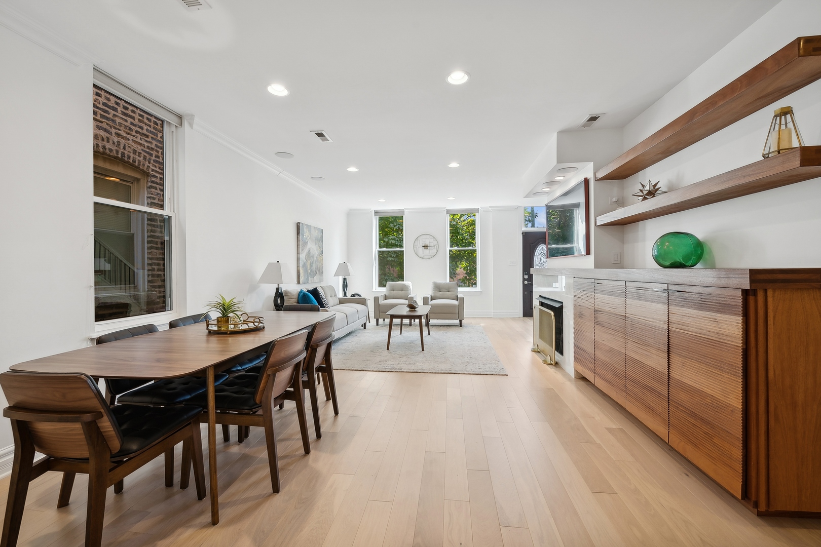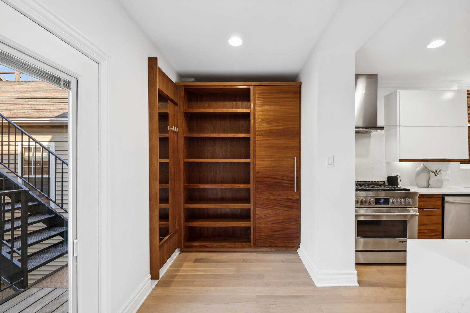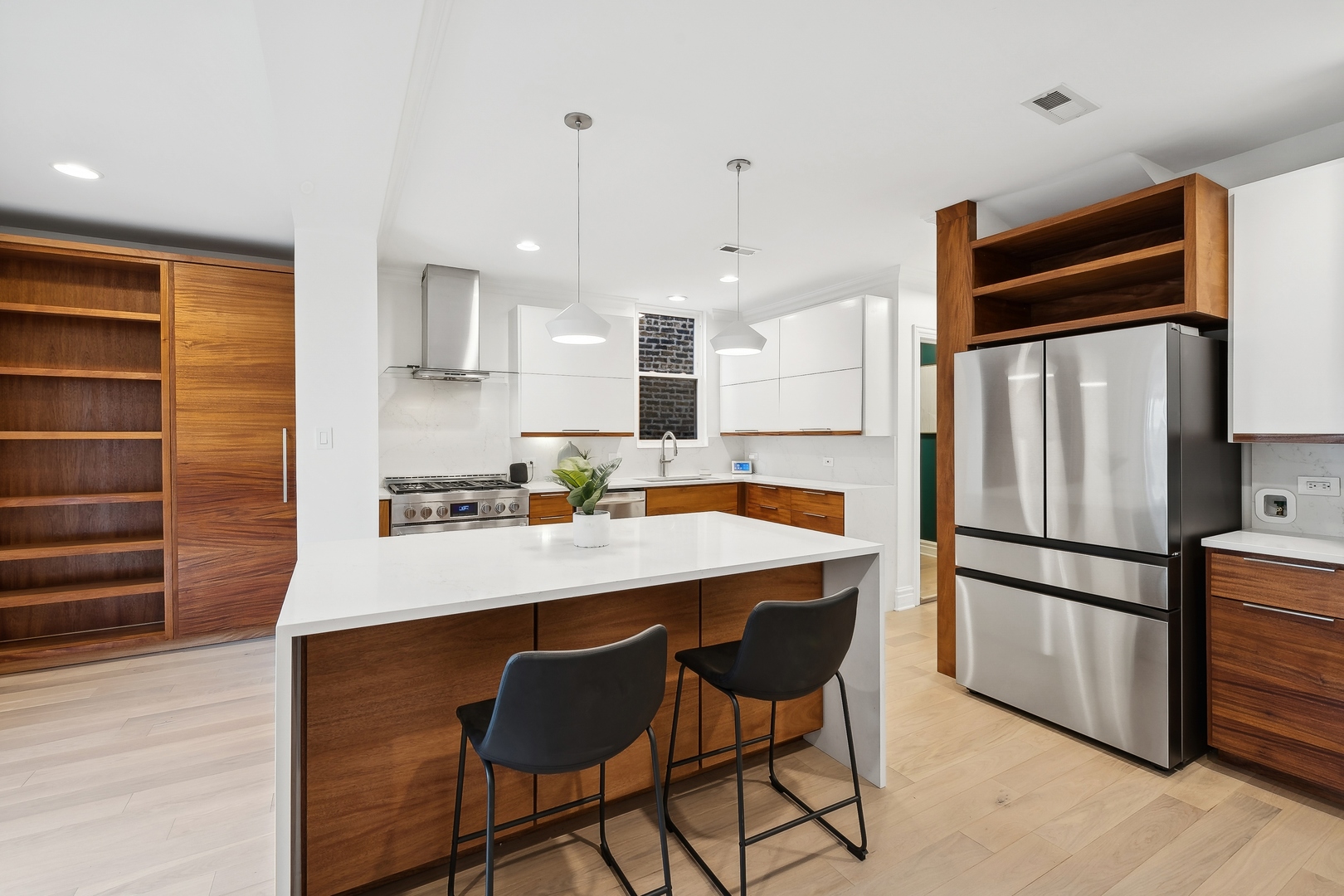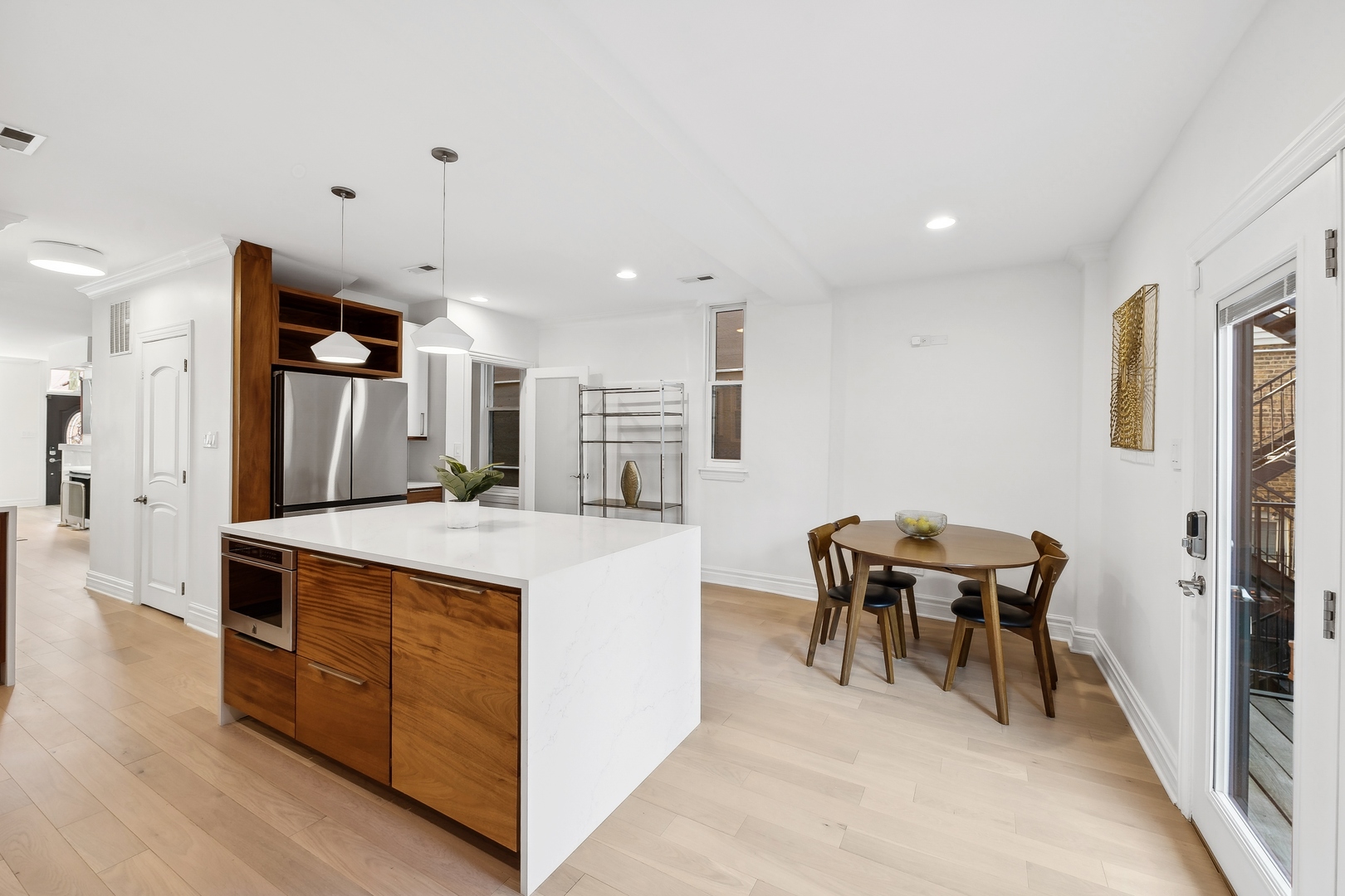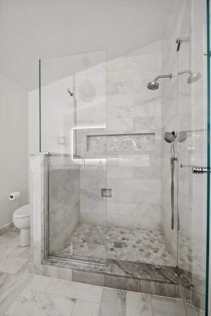 Welcome to this stunningly renovated home, perfectly situated in a premiere location of Bucktown which offers both serenity and convenience. Nestled on a quiet street, this residence provides a peaceful retreat while remaining easily accessible to nearby amenities and parks, including the free Holstein Park pool. The home has been meticulously updated featuring new engineered Hardwood Flooring (2022), Custom Cabinetry, new Paint Inside and Outside (2024) and additions to a peaceful Rooftop Deck. The spacious Family Room showcases exquisite Mahogany Custom Cabinetry, complemented by a gas ventless Fireplace. The Kitchen is a chef's dream, fully remodeled with Mahogany Custom Cabinetry, a double waterfall edge Quartz island, Jenn-Air Appliances with a Bespoke Refrigerator. Enjoy the convenience of a Walk-In Pantry and Mud Room drop zone. The home's layout is both functional and luxurious and the lower level is the perfect In-Law Suite. Included is a large 1-Bedroom space with a Full Kitchen, Full Bath, dedicated Washer and Dryer, large Family Room area and Dining Area. The newly created expansive Laundry Room located on the 2nd floor, accessible from the Master Closet or the Hallway features steel frame pocket doors and Custom Cabinetry, ensuring a practical and stylish space. The Primary Suite is a true sanctuary, boasting a 10x12 Custom Closet with Walnut built-ins and an additional Walnut closet with shoe shelving. The fully renovated Master Bath (2022) is a luxurious retreat with a custom 4x6 Marble Shower, Marble finishes throughout, LED anti-fog mirror, and custom Wenge wood floating vanity. Additional updates include Tankless Water Heater (2022), Tuckpointing (2023), painted Metal Railings and Stairs (2024), Cedar Pergola (2022), Ipe Deck and Landing (2021) and a landscaped Parkway with fencing (2021), ensuring both curb appeal and privacy. This home is ideally situated on a quiet, non-thoroughfare street, offering a serene living environment while remaining close to the local parks and community amenities.
