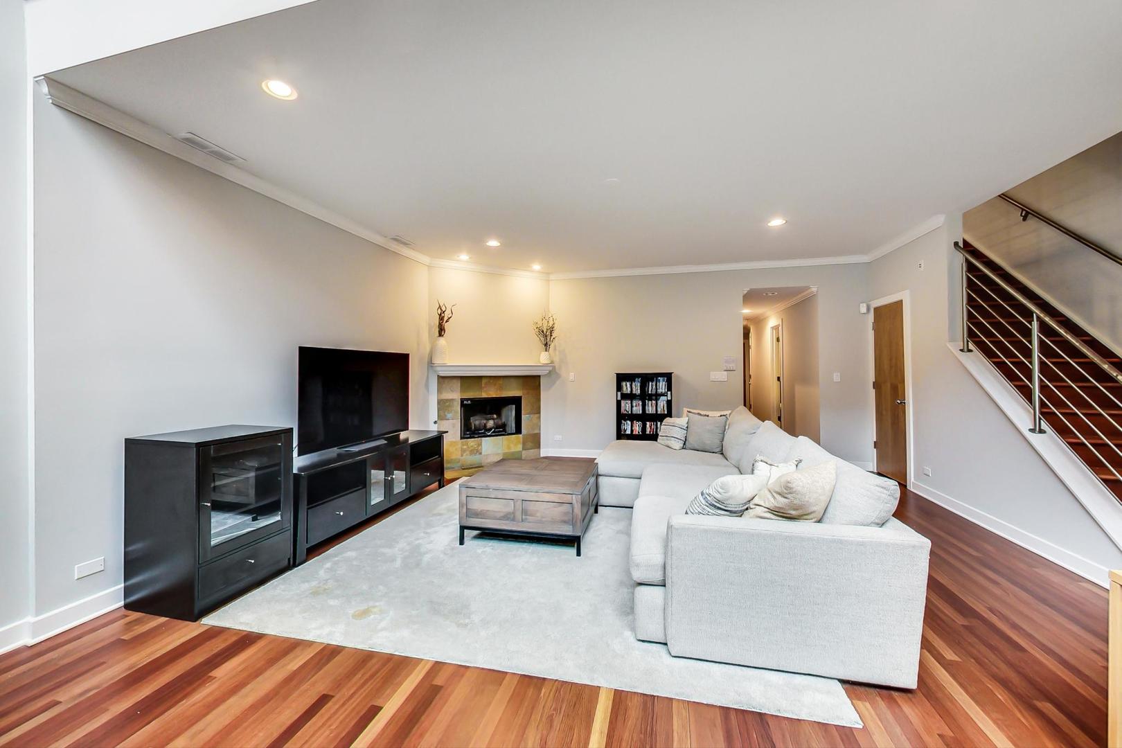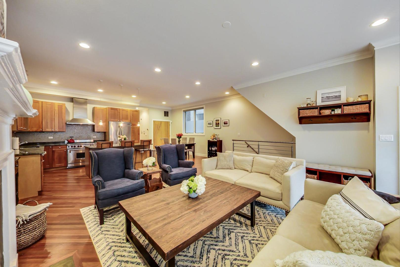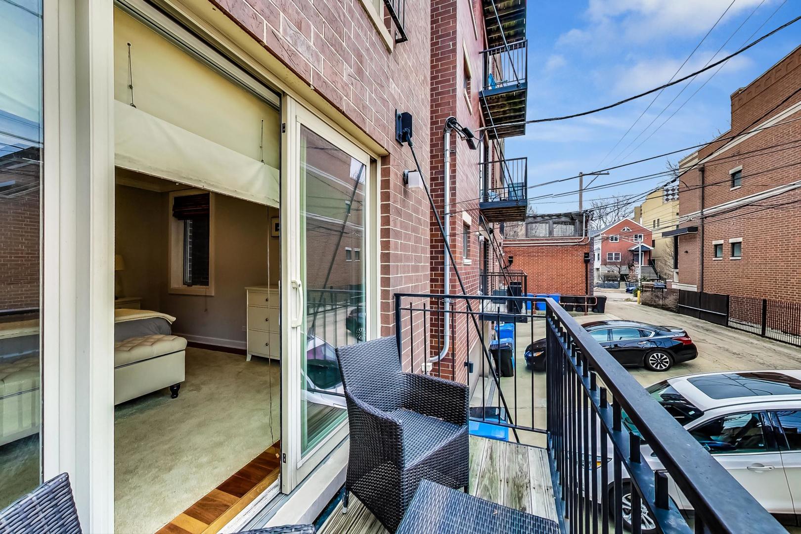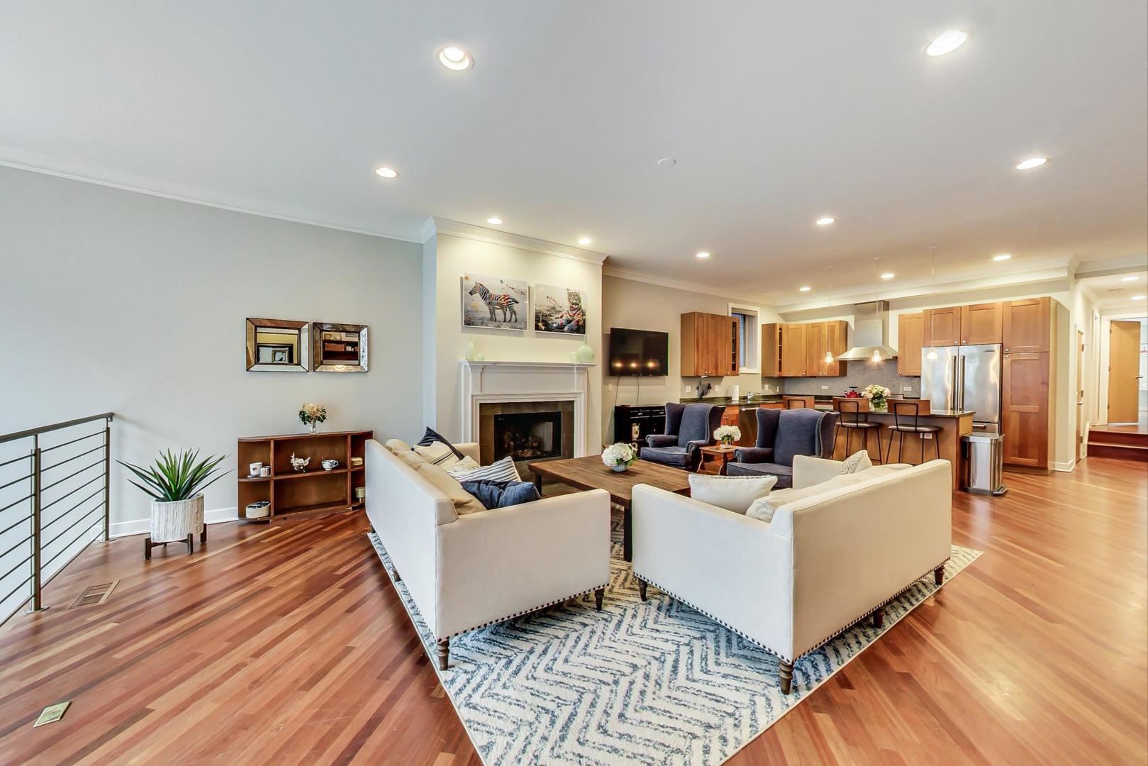 Fabulous EXTRA WIDE 3bed/3bath duplex down on coveted Wabansia Ave in the heart of Bucktown. This home boasts 22' wide interior, all brick masonry construction & ATTACHED garage parking right at your back door. With almost 2,700sqft, this home truly lives like a single family w/ two full levels of living, hardwood floors throughout, 2 fireplaces, crown moulding, and a dramatic two story wall of windows w/ motorized shades overlooking Wabansia. The unusually wide main level greets you with large windows and an expansive living/dining/kitchen space. Professional grade kitchen complete with 42'' cabinets, oversized granite island w/ ample seating, Wolf oven, & all high-end stainless steel appliances + wine fridge. Large main level primary suite complete with south facing balcony, tray ceiling, custom closet by Closet Works and a beautiful all stone primary bath with double sinks, whirlpool tub, and separate steam shower with body sprays. Second bedroom/office w/ organized closet & 2nd full bath also located on the main level. Fabulous lower level with dramatic ceiling height, huge family room w/ woodburning fireplace, & gracious walk-out patio. On the lower level you'll also find a 3rd well appointed bedroom, full bath, laundry room with side-by-side W/D & attached garage parking w/ heated driveway. FANTASTIC Bucktown location with the 606, blue line, and all the bars & restaurants at your fingertips.