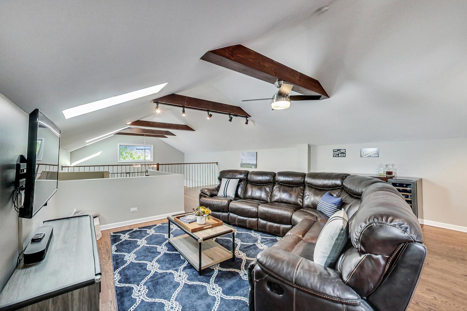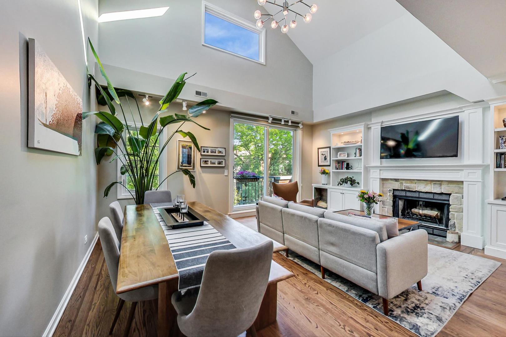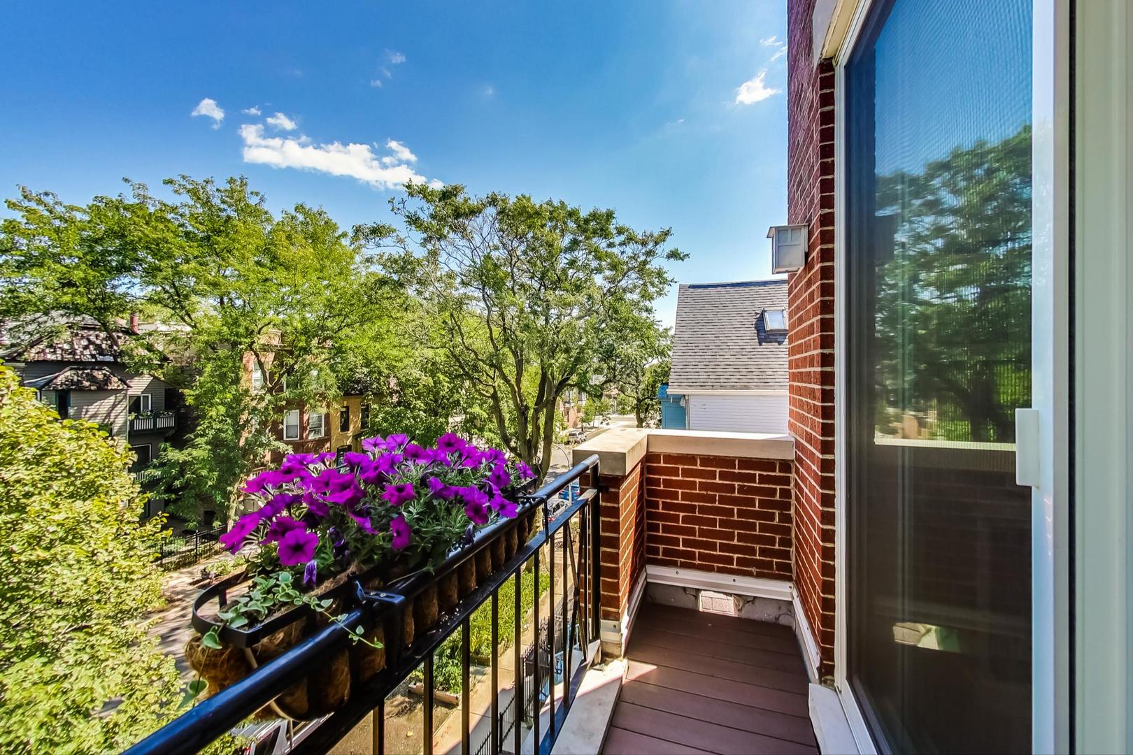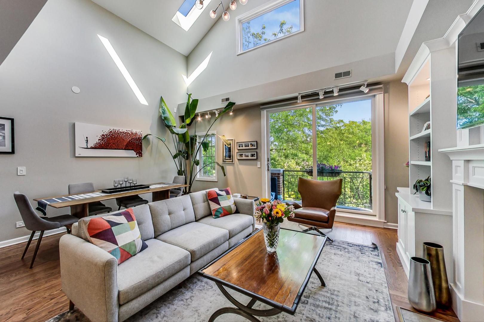 Don't miss this expansive, sophisticated 3bed/2bath + office on one of Lakeview's best blocks - complete w/ TWO oversized decks & garage parking. This duplex penthouse experience begins w/ a private entry staircase that leads up to the bright and airy living room & formal dining area with vaulted cathedral ceilings and skylights, allowing for great natural light throughout. Chic white built-ins flank the woodburning fireplace adding both style and function w/ a bar area & storage. The main level also boasts hardwood floors, new crown moulding, millwork & wainscoting throughout. Beautifully updated eat-in kitchen features white shaker-style cabinets, granite countertops, natural stone backsplash, and all SS appliances. Fridge, dishwasher, oven/range & microwave all replaced in 2020. The lovely primary suite is sure to impress w/ double closets and a spa-like en-suite bath w/ walnut farm door, heated floors, massive marble shower, & dual vanity. From the primary suite, brand new sliding glass doors lead you to one of two oversized and freshly upgraded decks tricked out with composite decking, railings & custom lighting. The bright & well-appointed second bedroom w/ newly added closet and second full bathroom are also located on the main level. Retreat upstairs to the spacious and inviting family room on the second level, as well as the generously-sized third bedroom and brand new home office. Dark wood beams & numerous skylights create the perfect second level of versatile live/work space. Enjoy other outdoor entertaining options with an additional oversized deck on the second level as well as the front balcony. GARAGE PARKING included. PRIME Lakeview location just a few blocks from Southport Corridor, all the great restaurants, shopping, and nightlife as well as Whole Foods and BOTH the red and brown lines. Level 1+ Nettelhorst Elem School. HOA $257/mo. Taxes $12,010.27. *Second floor office is plumbed and could easily be converted to a 3rd bathroom