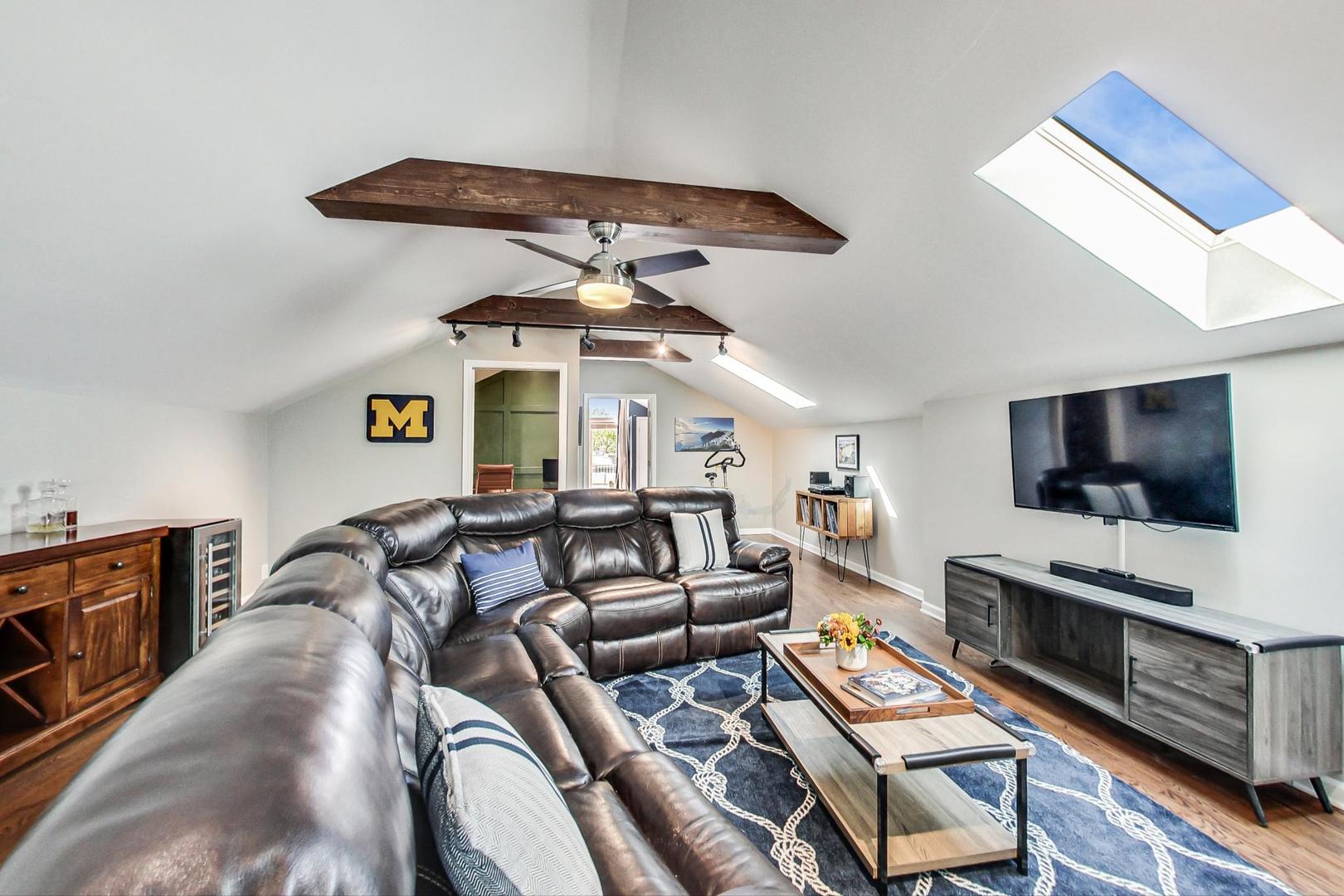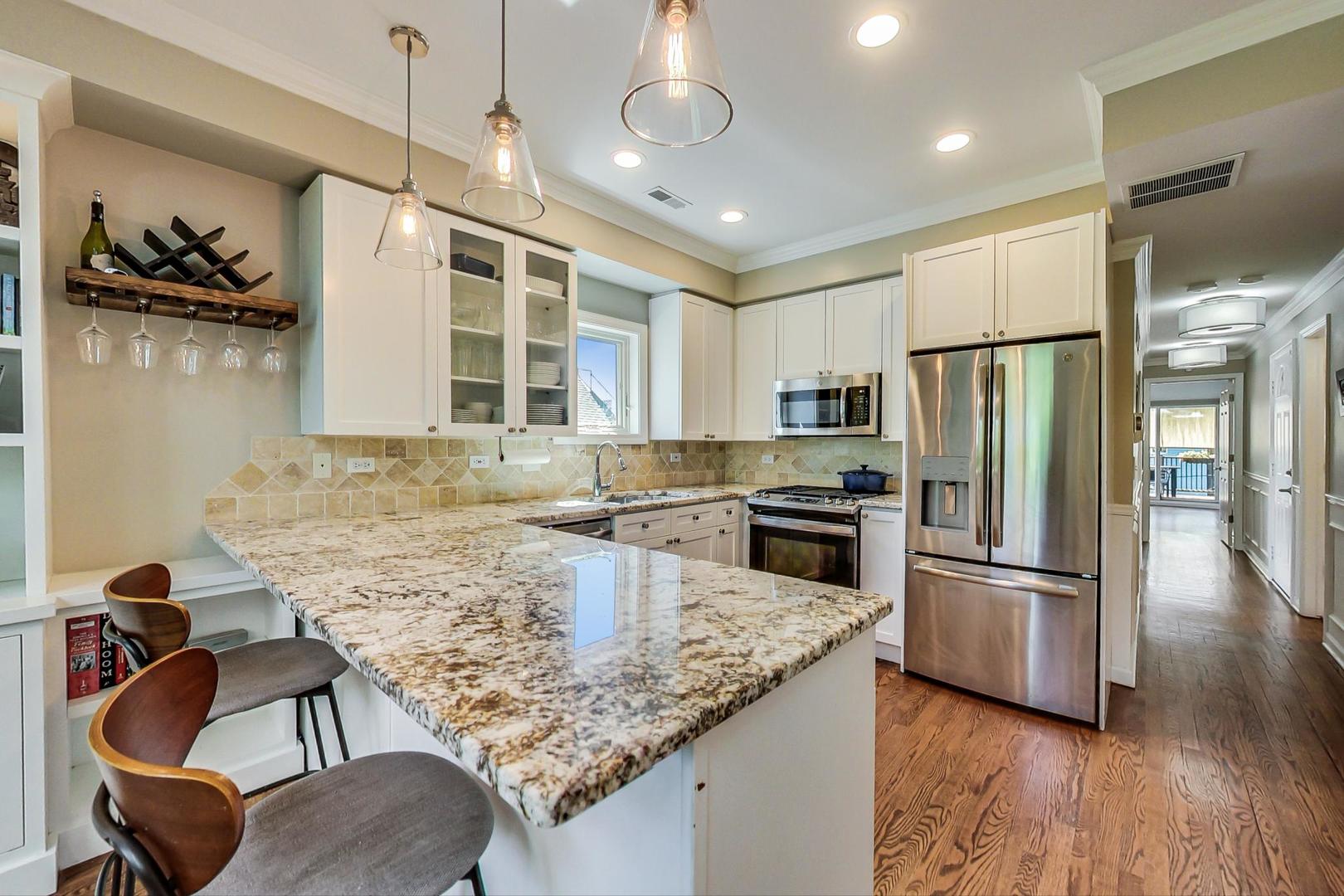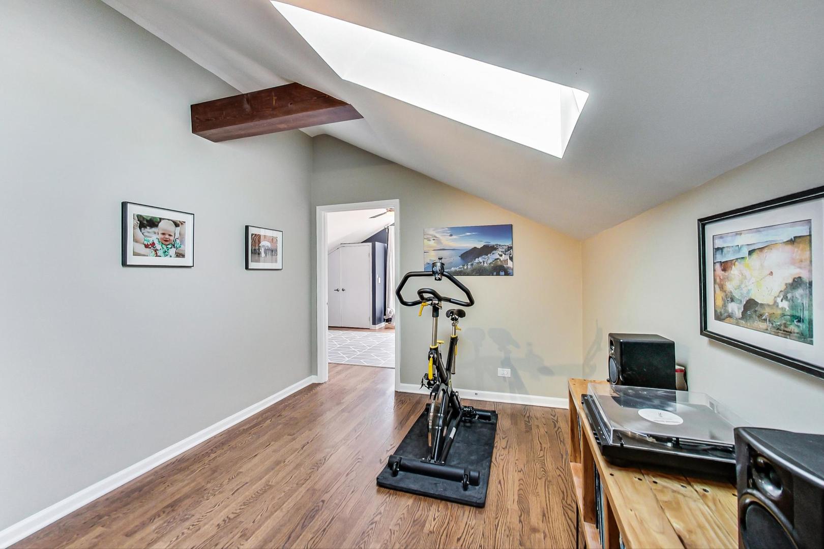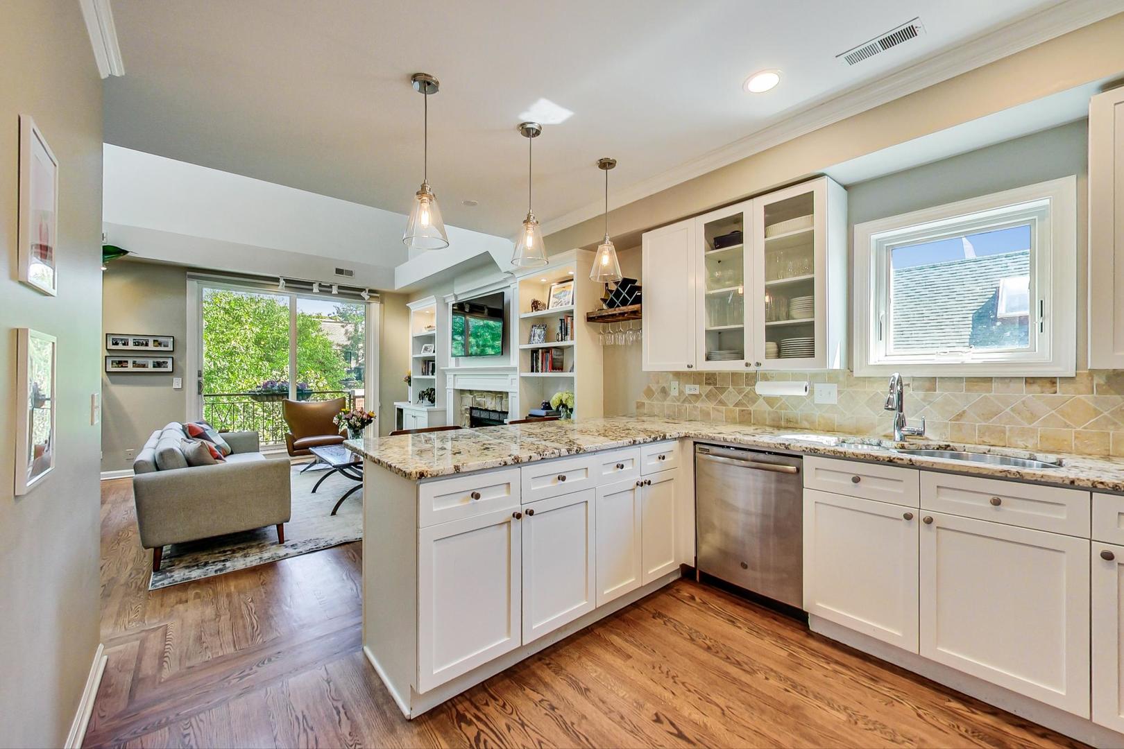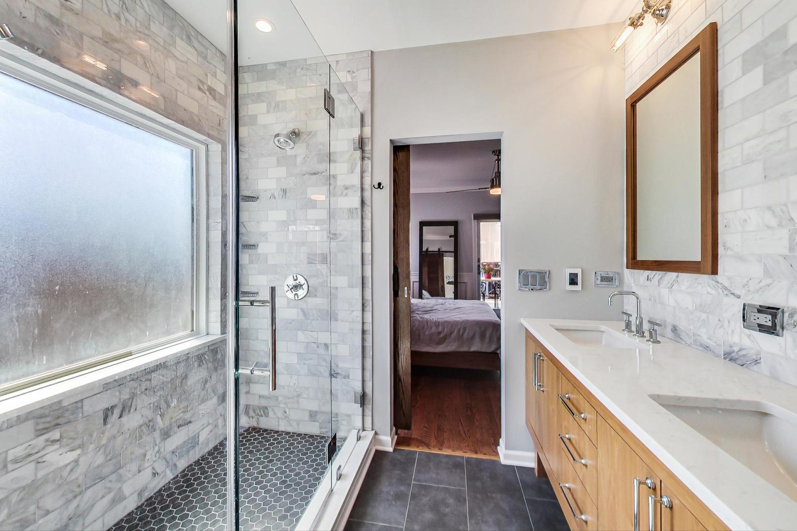 Don't miss this expansive, sophisticated 3bed/2bath + office on one of Lakeview's best blocks - complete w/ TWO oversized decks & garage parking. This duplex penthouse experience begins w/ a private entry staircase that leads up to the bright and airy living room & formal dining area with vaulted cathedral ceilings and skylights, allowing for great natural light throughout. Chic white built-ins flank the woodburning fireplace adding both style and function w/ a bar area & storage. The main level also boasts hardwood floors, new crown moulding, millwork & wainscoting throughout. Beautifully updated eat-in kitchen features white shaker-style cabinets, granite countertops, natural stone backsplash, and all SS appliances. Fridge, dishwasher, oven/range & microwave all replaced in 2020. The lovely primary suite is sure to impress w/ double closets and a spa-like en-suite bath w/ walnut farm door, heated floors, massive marble shower, & dual vanity. From the primary suite, brand new sliding glass doors lead you to one of two oversized and freshly upgraded decks tricked out with composite decking, railings & custom lighting. The bright & well-appointed second bedroom w/ newly added closet and second full bathroom are also located on the main level. Retreat upstairs to the spacious and inviting family room on the second level, as well as the generously-sized third bedroom and brand new home office. Dark wood beams & numerous skylights create the perfect second level of versatile live/work space. Enjoy other outdoor entertaining options with an additional oversized deck on the second level as well as the front balcony. GARAGE PARKING included. PRIME Lakeview location just a few blocks from Southport Corridor, all the great restaurants, shopping, and nightlife as well as Whole Foods and BOTH the red and brown lines. Level 1+ Nettelhorst Elem School. HOA $257/mo. Taxes $12,010.27. *Second floor office is plumbed and could easily be converted to a 3rd bathroom